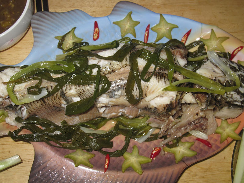 Mẹ thì dễ lắm, ăn gì cũng được, và nhất là dạo này đang ăn kiêng nên cũng ko có ý kiến gì nhiều, chỉ làm theo yêu cầu của "thực khách" là Ba G thôi hihi. Như thường lệ thì Ba ôm bịch rau đi nhặt và rửa sạch, mẹ chỉ nấu thôi nên nhanh ơi là nhanh, ko mệt gì hết trơn hihi. Chị tiếc là Ba đi chơ nên cũng thiết sót nhiều thứ, ví dụ như quên ko mua khế chua và củ sắn, cà rốt về để xào lên bỏ lên với món cá hấp, thôi kệ, vậy cũng giỏi rồi hìhì.